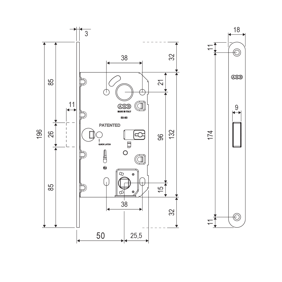 Rozteč: 96 mm (vzdálenost mezi otvorem na kliky a vložkou/klíčem)