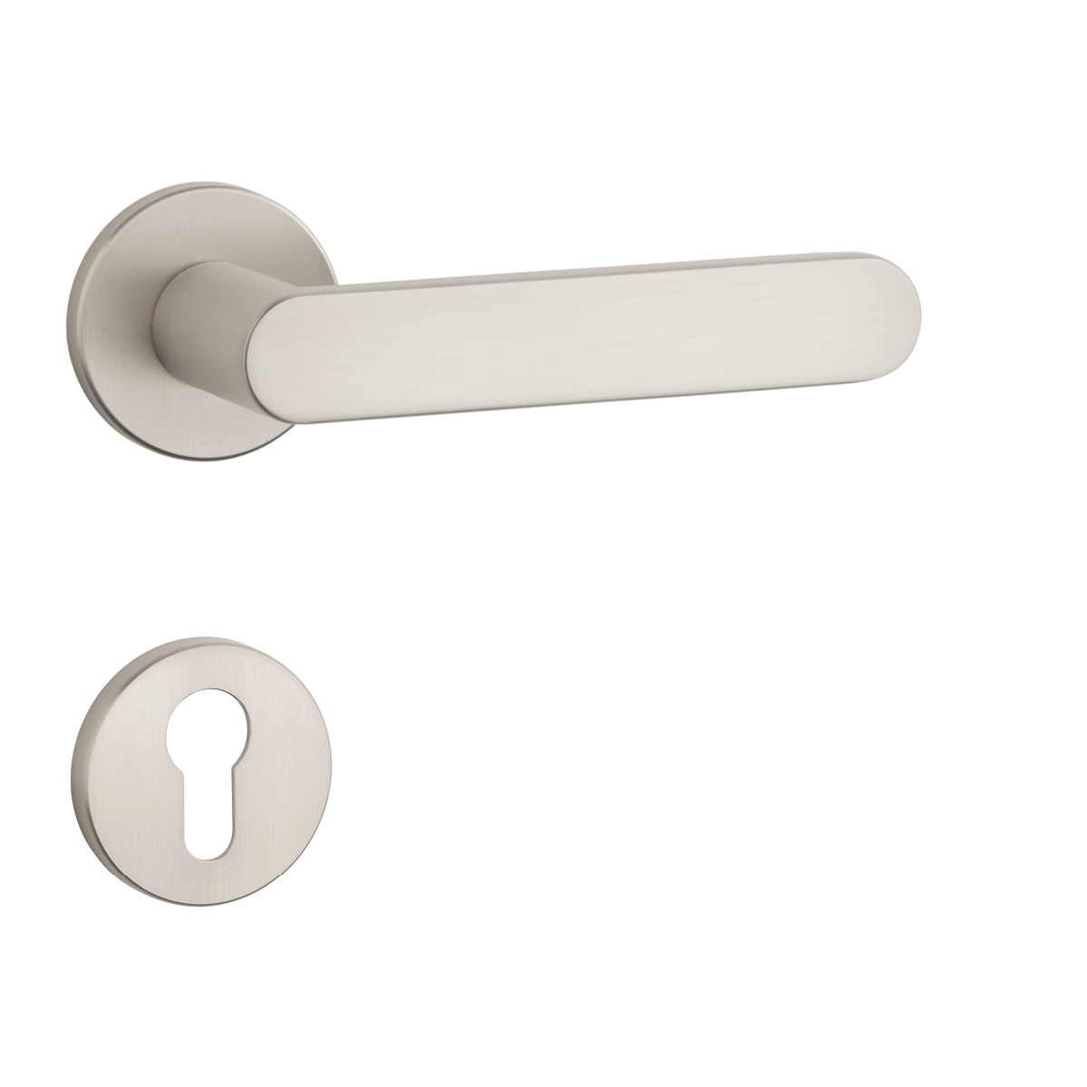 Rozetová klika na interiérové dveře s kulatou rozetou je vyrobena z materiálů vysoké kvality - zamak a je povrchově upravena. Rozeta má průměr 52 mm a tloušťku jen 7 mm. Minimalistický design rozety s vysokou stabilitou kliky na dveřích působí jemně, a tím ponechává prostor pro vyniknutí designu samotné kliky.