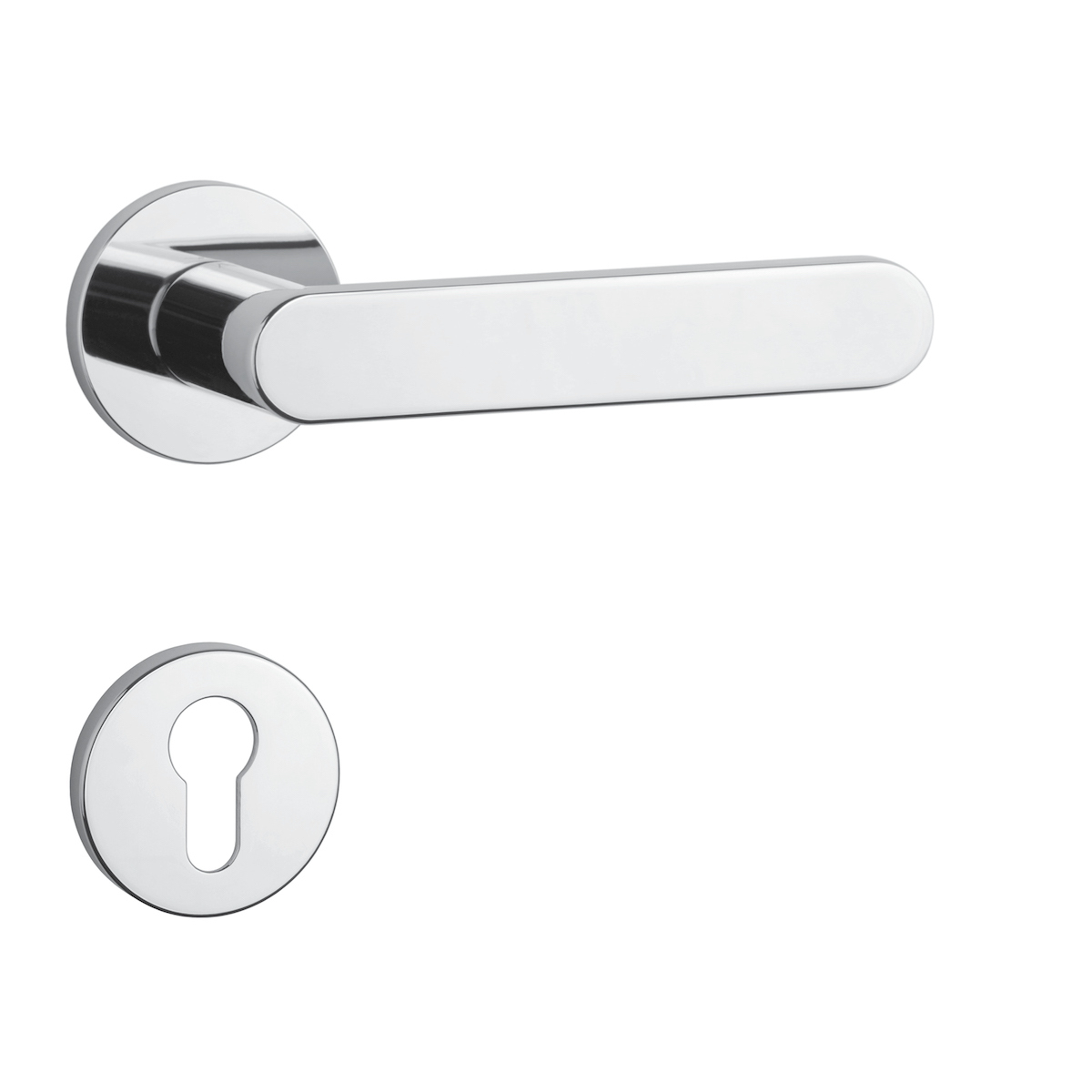 Rozetová klika na interiérové dveře s kulatou rozetou je vyrobena z materiálů vysoké kvality - zamak a je povrchově upravena. Rozeta má průměr 52 mm a tloušťku jen 7 mm. Minimalistický design rozety s vysokou stabilitou kliky na dveřích působí jemně, a tím ponechává prostor pro vyniknutí designu samotné kliky.