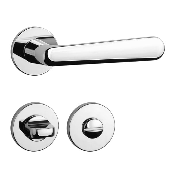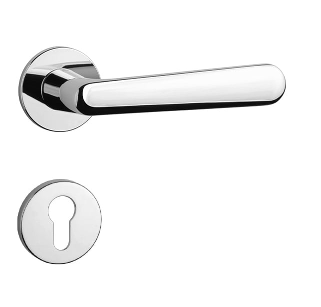 Rozetová klika na interiérové dveře s kulatou rozetou je vyrobena z materiálů vysoké kvality - zamak a je povrchově upravena. Rozeta má průměr 52 mm a tloušťku jen 5 mm. Minimalistický design rozety s vysokou stabilitou kliky na dveřích působí jemně, a tím ponechává prostor pro vyniknutí designu samotné kliky.