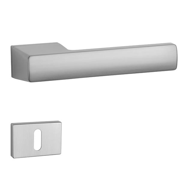 Rozetová klika na interiérové dveře s obdélníkovou rozetou je vyrobena z materiálů vysoké kvality - zamak a je povrchově upravena. Rozeta má rozměr 52 x 33 mm a tloušťku jen 7 mm. Minimalistický design rozety s vysokou stabilitou kliky na dveřích působí jemně, a tím ponechává prostor pro vyniknutí designu samotné kliky.