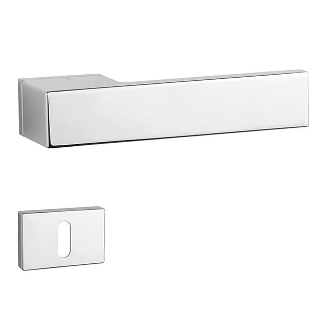 Rozetová klika na interiérové dveře s obdélníkovou rozetou je vyrobena z materiálů vysoké kvality - zamak a je povrchově upravena. Rozeta má rozměr 52 x 33 mm a tloušťku jen 7 mm. Minimalistický design rozety s vysokou stabilitou kliky na dveřích působí jemně, a tím ponechává prostor pro vyniknutí designu samotné kliky.