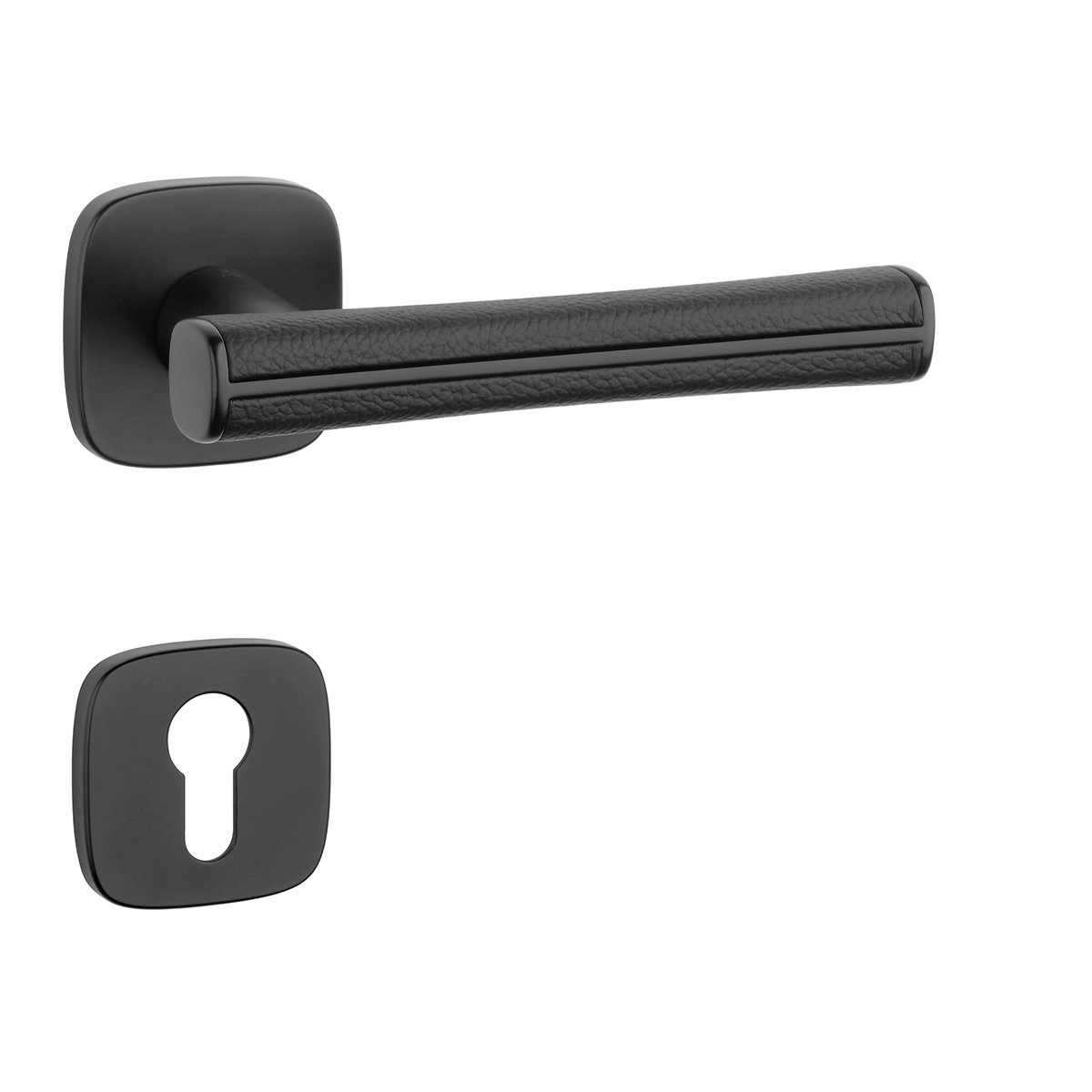 Rozetová klika na interiérové dveře s hranatou oblou rozetou je vyrobená z materiálů vysoké kvality - zamak a je povrchově upravená. Speciální efekt vytváří černá kůže, která obepíná rukojeť kliky.
