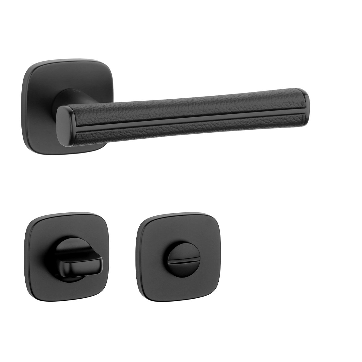 Rozetová klika na interiérové dveře s hranatou oblou rozetou je vyrobená z materiálů vysoké kvality - zamak a je povrchově upravená. Speciální efekt vytváří černá kůže, která obepíná rukojeť kliky.