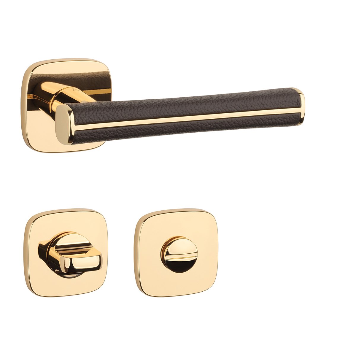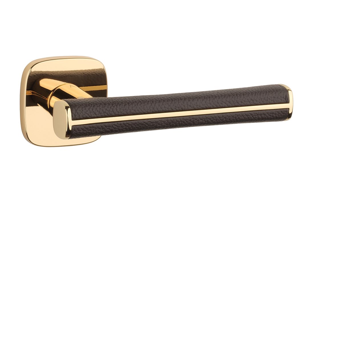 Rozetová klika na interiérové dveře s hranatou oblou rozetou je vyrobená z materiálů vysoké kvality - zamak a je povrchově upravená. Speciální efekt vytváří hnědá kůže, která obepíná rukojeť kliky.