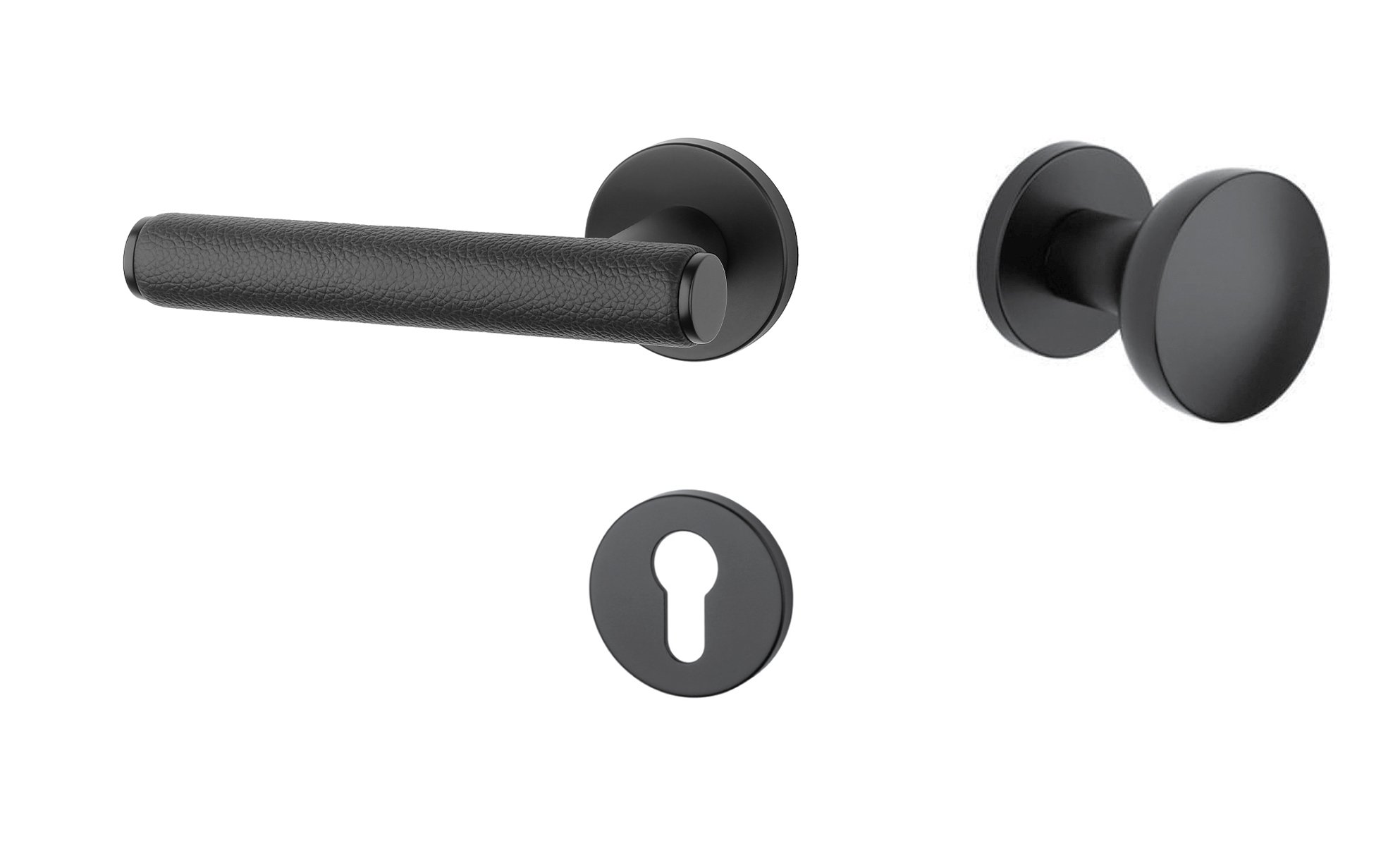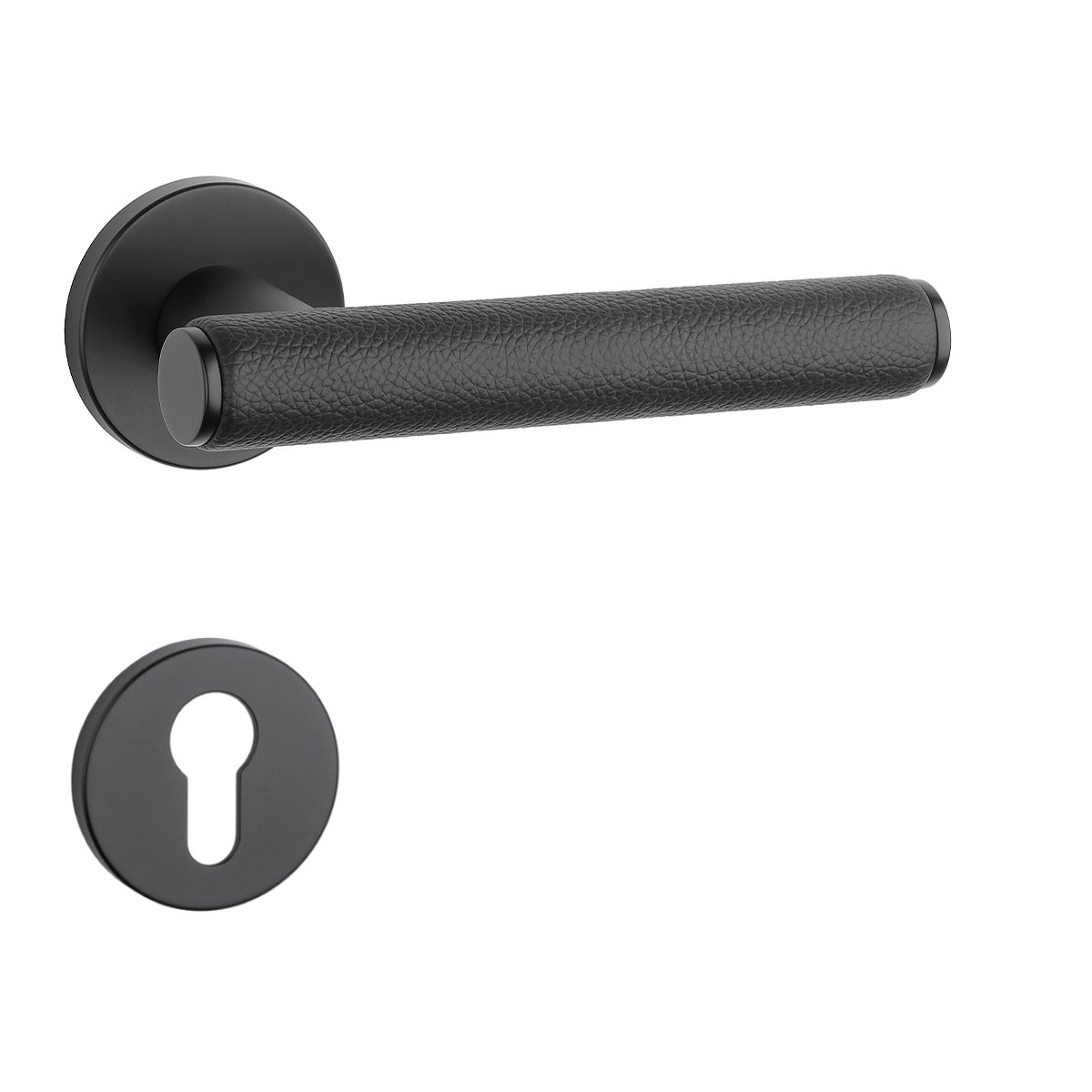 Rozetová klika na interiérové dveře s kulatou rozetou je vyrobena z materiálů vysoké kvality - zamak a je povrchově upravena. Zajímavým prvkem je černá kůže, která obepíná rukojeť kliky.