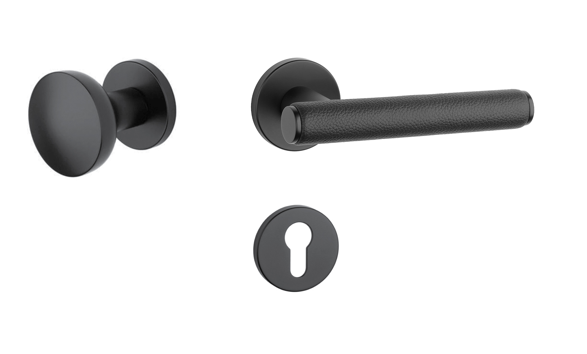Rozetová klika na interiérové dveře s kulatou rozetou je vyrobena z materiálů vysoké kvality - zamak a je povrchově upravena. Zajímavým prvkem je černá kůže, která obepíná rukojeť kliky.