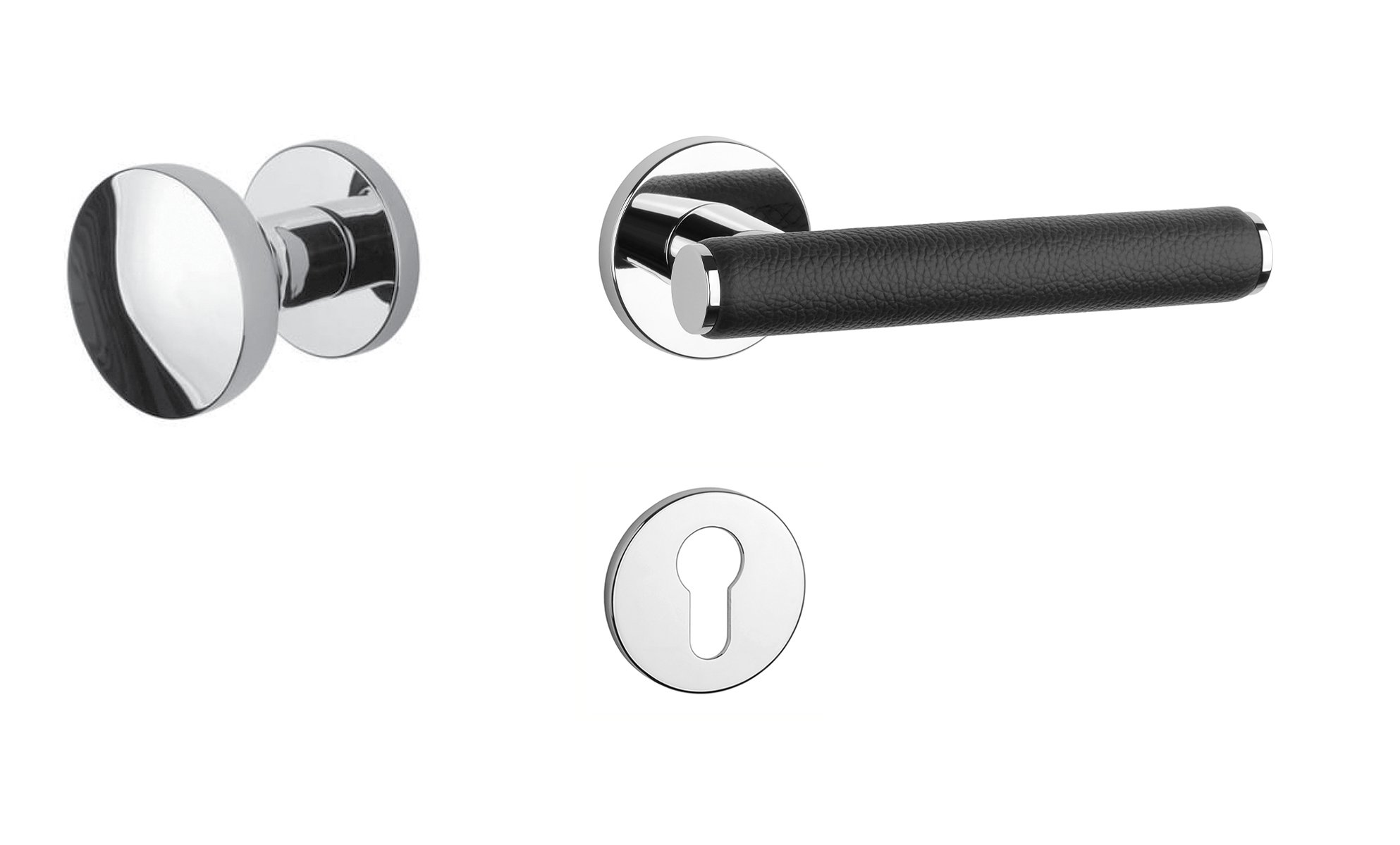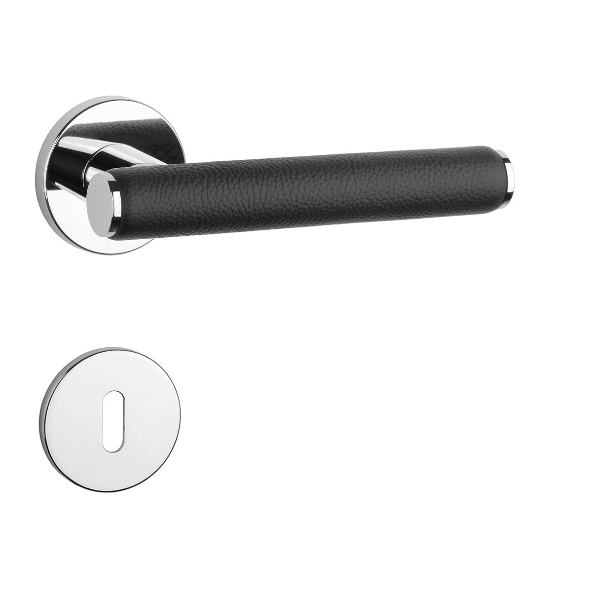 Rozetová klika na interiérové dveře s kulatou rozetou je vyrobena z materiálů vysoké kvality - zamak a je povrchově upravena. Zajímavým prvkem je černá kůže, která obepíná rukojeť kliky.
