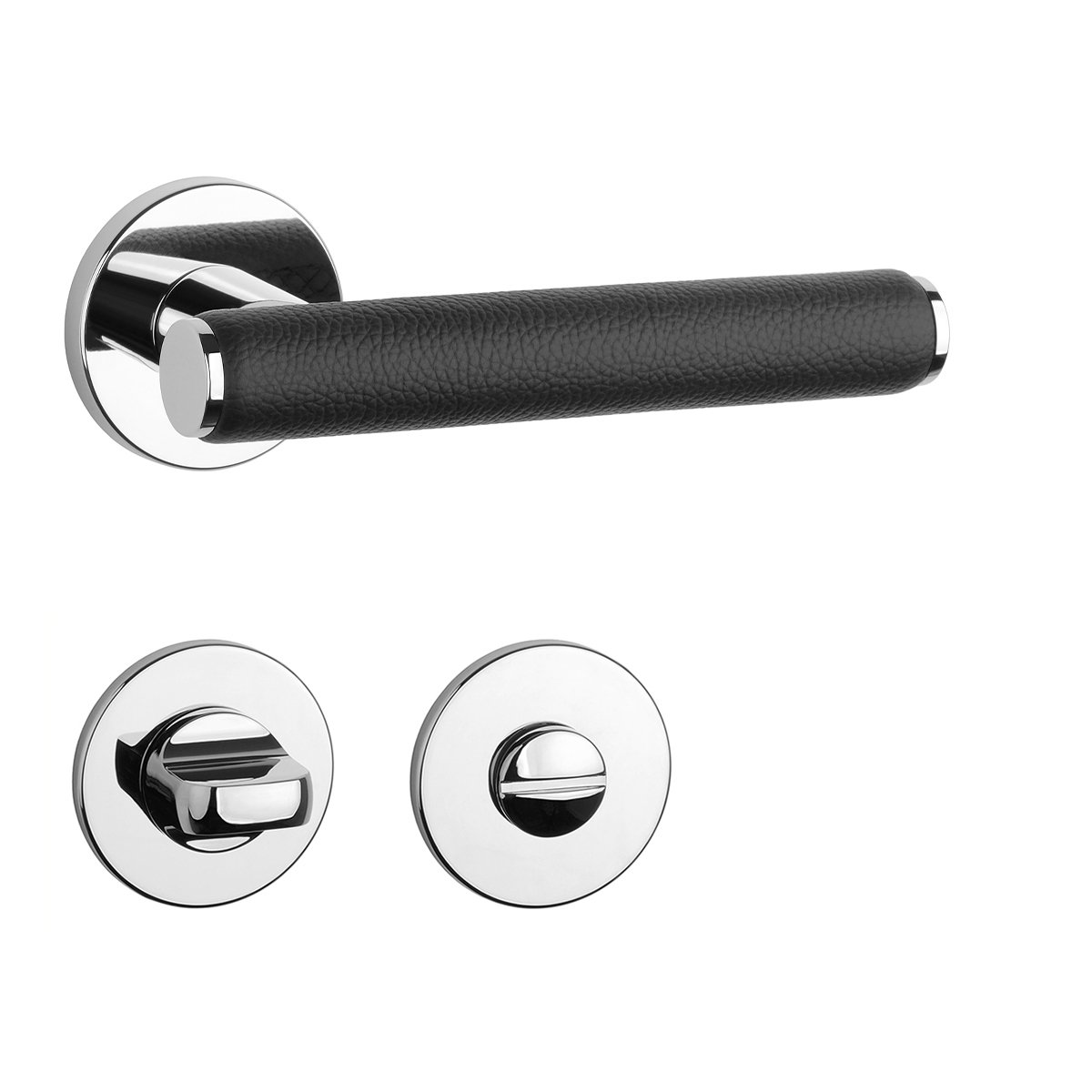 Rozetová klika na interiérové dveře s kulatou rozetou je vyrobena z materiálů vysoké kvality - zamak a je povrchově upravena. Zajímavým prvkem je černá kůže, která obepíná rukojeť kliky.