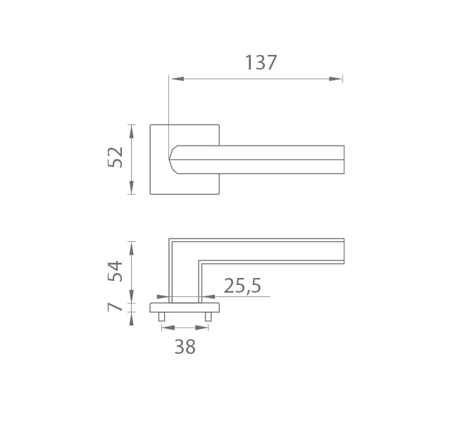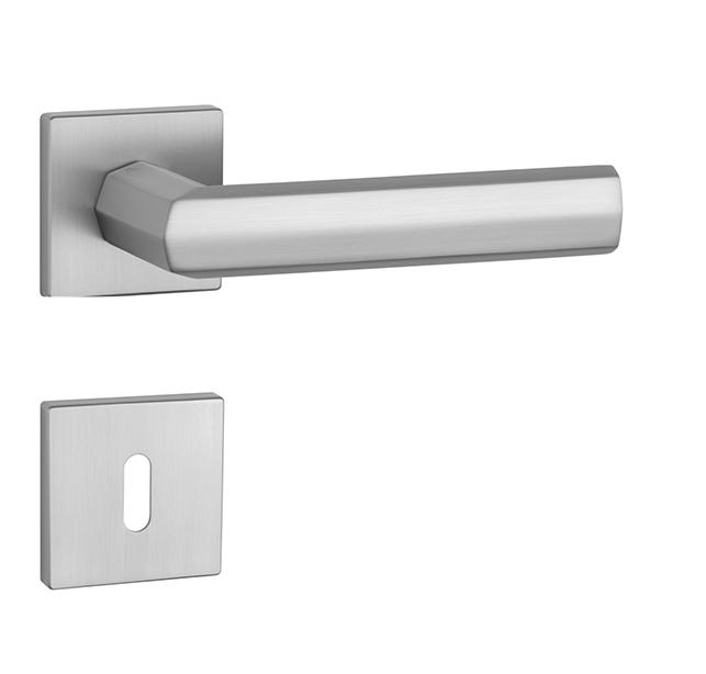 Rozetová klika na interiérové dveře s hranatou rozetou je vyrobena z materiálů vysoké kvality - zamak a je povrchově upravena. Rozeta má rozměry 52x52 mm a tloušťku jen 7 mm. Minimalistický design rozety s vysokou stabilitou kliky na dveřích působí jemně, a tím ponechává prostor pro vyniknutí designu samotné kliky.