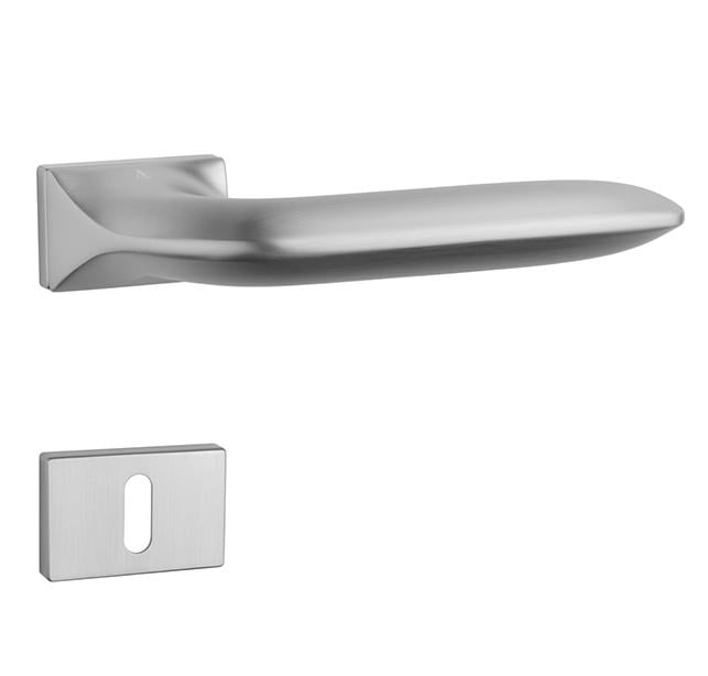 Rozetová klika na interiérové dveře s obdélníkovou rozetou je vyrobena z materiálů vysoké kvality - zamak a je povrchově upravena. Rozeta má rozměr 52 x 33 mm a tloušťku jen 7 mm. Minimalistický design rozety s vysokou stabilitou kliky na dveřích působí jemně, a tím ponechává prostor pro vyniknutí designu samotné kliky.