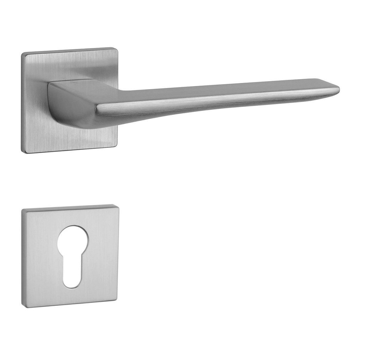 Rozetová klika na interiérové dveře s hranatou rozetou je vyrobena z materiálů vysoké kvality - zamak a je povrchově upravena. Rozeta má rozměr 52x52 mm a tloušťku jen 5 mm. Minimalistický design rozety s vysokou stabilitou kliky na dveřích působí jemně, a tím ponechává prostor pro vyniknutí designu samotné kliky.
