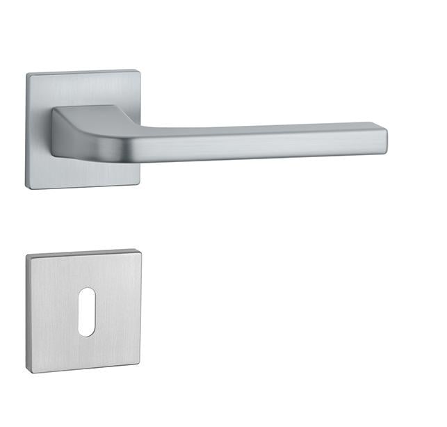 Rozetová klika na interiérové dveře s hranatou rozetou je vyrobena z materiálů vysoké kvality - zamak a je povrchově upravena. Rozeta má rozměr 52x52 mm a tloušťku jen 7 mm. Minimalistický design rozety s vysokou stabilitou kliky na dveřích působí jemně, a tím ponechává prostor pro vyniknutí designu samotné kliky.