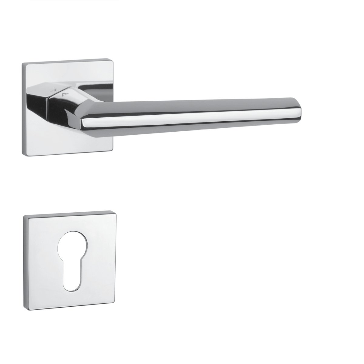 Rozetová klika na interiérové dveře s hranatou rozetou je vyrobena z materiálů vysoké kvality - zamak a je povrchově upravena. Rozeta má rozměry 52x52 mm a tloušťku jen 7 mm. Minimalistický design rozety s vysokou stabilitou kliky na dveřích působí jemně, a tím ponechává prostor pro vyniknutí designu samotné kliky.