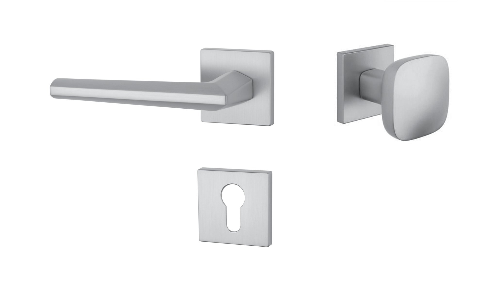 Rozetová klika na interiérové dveře s hranatou rozetou je vyrobena z materiálů vysoké kvality - zamak a je povrchově upravena. Rozeta má rozměry 52x52 mm a tloušťku jen 7 mm. Minimalistický design rozety s vysokou stabilitou kliky na dveřích působí jemně, a tím ponechává prostor pro vyniknutí designu samotné kliky.