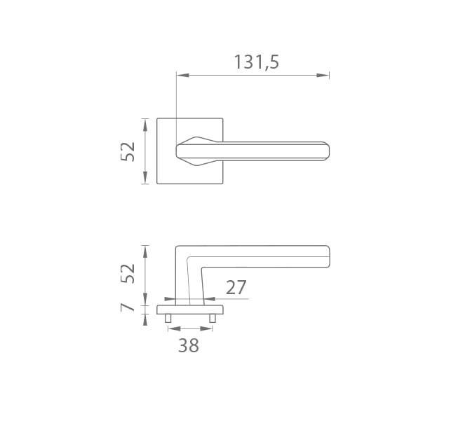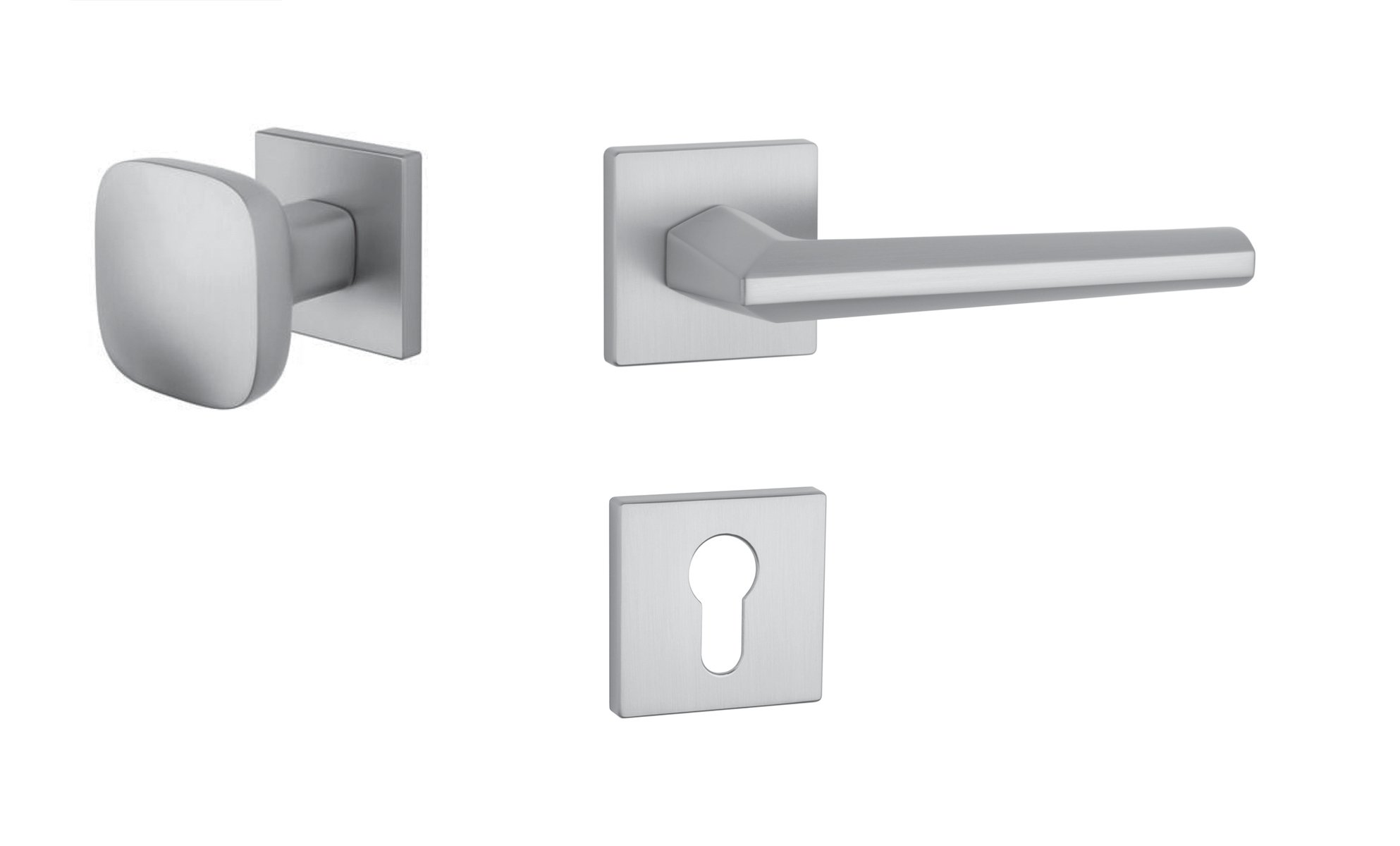 Rozetová klika na interiérové dveře s hranatou rozetou je vyrobena z materiálů vysoké kvality - zamak a je povrchově upravena. Rozeta má rozměry 52x52 mm a tloušťku jen 7 mm. Minimalistický design rozety s vysokou stabilitou kliky na dveřích působí jemně, a tím ponechává prostor pro vyniknutí designu samotné kliky.