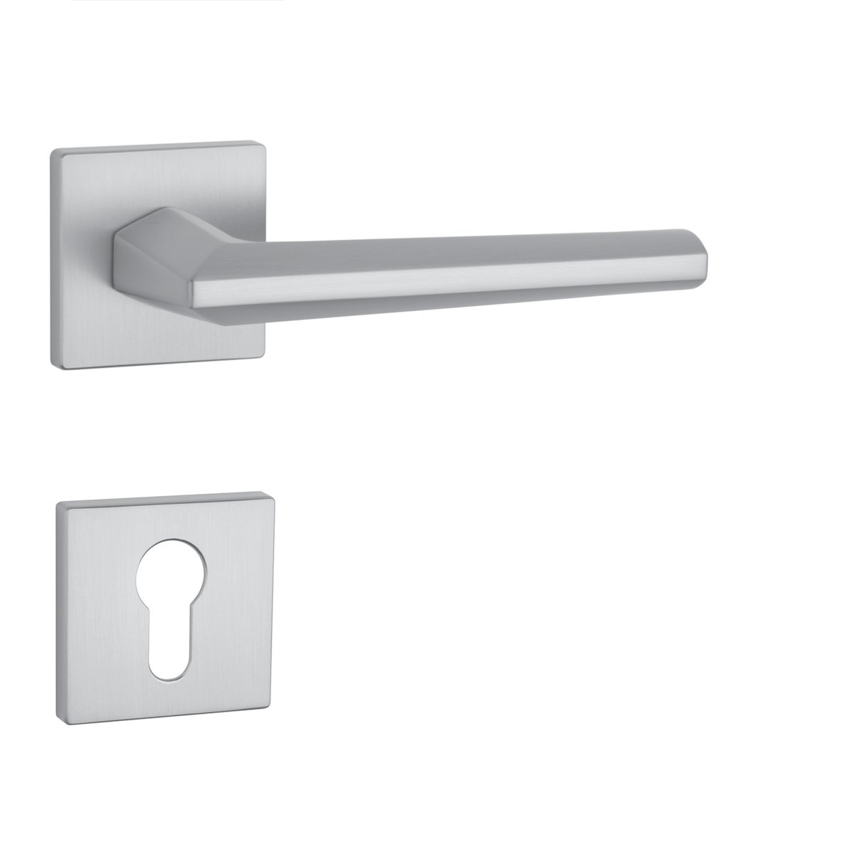 Rozetová klika na interiérové dveře s hranatou rozetou je vyrobena z materiálů vysoké kvality - zamak a je povrchově upravena. Rozeta má rozměry 52x52 mm a tloušťku jen 7 mm. Minimalistický design rozety s vysokou stabilitou kliky na dveřích působí jemně, a tím ponechává prostor pro vyniknutí designu samotné kliky.