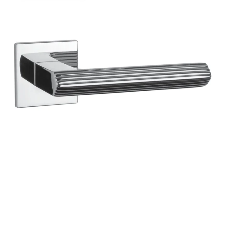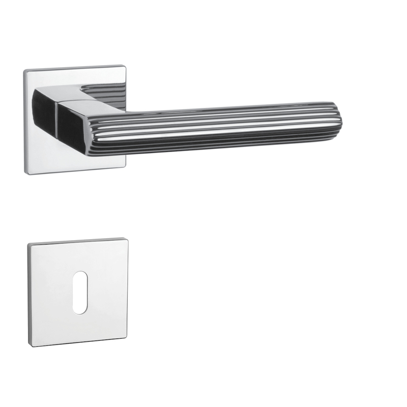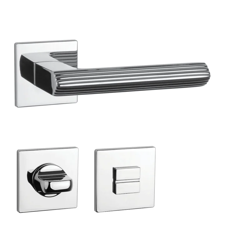 Rozetová klika na interiérové dveře s hranatou rozetou je vyrobena z materiálů vysoké kvality - zamak a je povrchově upravena. Rozeta má rozměr 52x52 mm a tloušťku jen 5 mm. Minimalistický design rozety s vysokou stabilitou kliky na dveřích působí jemně, a tím ponechává prostor pro vyniknutí designu samotné kliky.