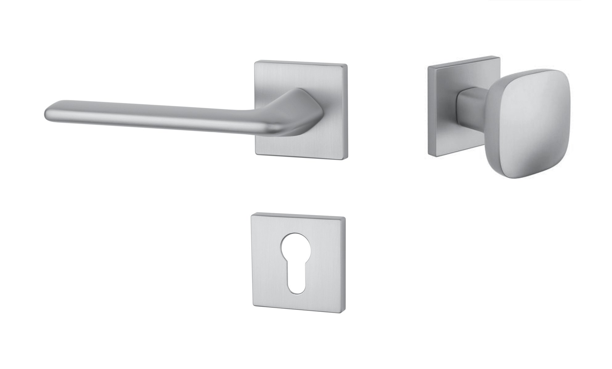 Rozetová klika na interiérové dveře s hranatou rozetou je vyrobena z materiálů vysoké kvality - zamak a je povrchově upravena. Rozeta má rozměry 52x52 mm a tloušťku jen 7 mm. Minimalistický design rozety s vysokou stabilitou kliky na dveřích působí jemně, a tím ponechává prostor pro vyniknutí designu samotné kliky.
