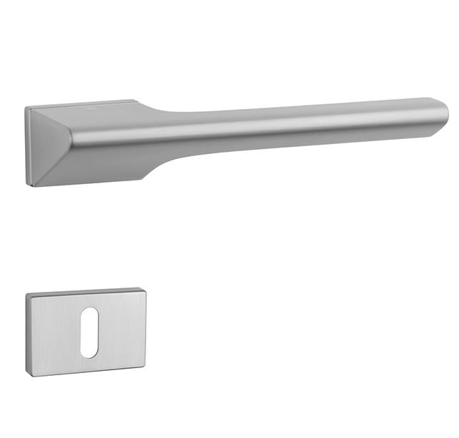 Rozetová klika na interiérové dveře s obdélníkovou rozetou je vyrobena z materiálů vysoké kvality - zamak a je povrchově upravena. Rozeta má rozměr 52 x 33 mm a tloušťku jen 7 mm. Minimalistický design rozety s vysokou stabilitou kliky na dveřích působí jemně, a tím ponechává prostor pro vyniknutí designu samotné kliky.