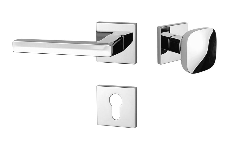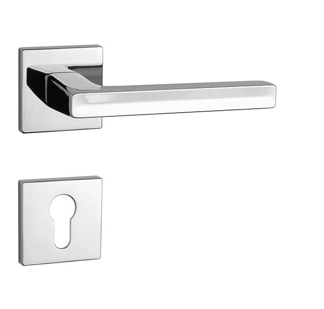 Rozetová klika na interiérové dveře s hranatou rozetou je vyrobena z materiálů vysoké kvality - zamak a je povrchově upravena. Rozeta má rozměr 52x52 mm a tloušťku jen 7 mm. Minimalistický design rozety s vysokou stabilitou kliky na dveřích působí jemně, a tím ponechává prostor pro vyniknutí designu samotné kliky.