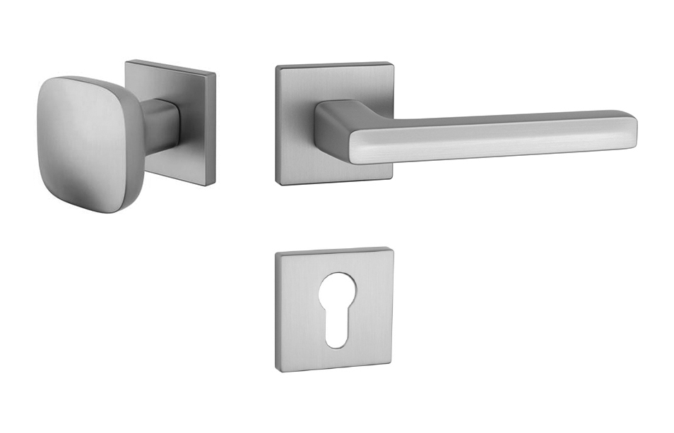Rozetová klika na interiérové dveře s hranatou rozetou je vyrobena z materiálů vysoké kvality - zamak a je povrchově upravena. Rozeta má rozměr 52x52 mm a tloušťku jen 7 mm. Minimalistický design rozety s vysokou stabilitou kliky na dveřích působí jemně, a tím ponechává prostor pro vyniknutí designu samotné kliky.