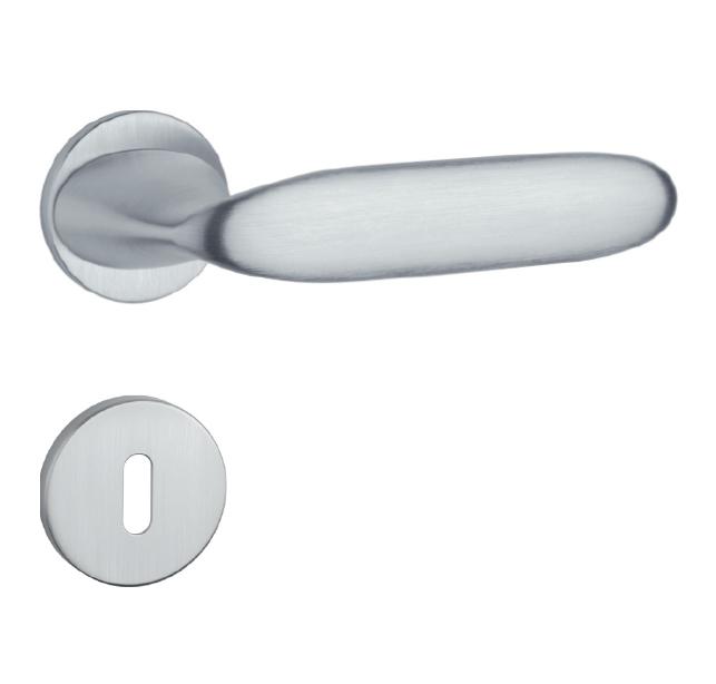 Rozetová klika na interiérové dveře s kulatou rozetou je vyrobena z materiálů vysoké kvality - zamak a je povrchově upravena. Rozeta má průměr 52 mm a tloušťku jen 7 mm. Minimalistický design rozety s vysokou stabilitou kliky na dveřích působí jemně, a tím ponechává prostor pro vyniknutí designu samotné kliky.