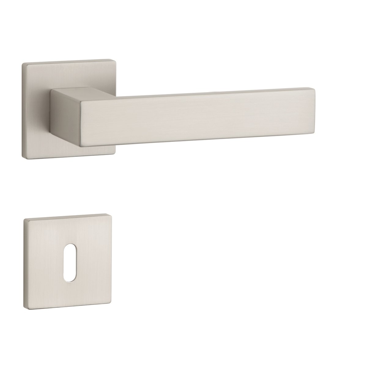 Rozetová klika na interiérové dveře s hranatou rozetou je vyrobena z materiálů vysoké kvality - zamak a je povrchově upravena. Rozeta má rozměry 52x52 mm a tloušťku jen 7 mm. Minimalistický design rozety s vysokou stabilitou kliky na dveřích působí jemně, a tím ponechává prostor pro vyniknutí designu samotné kliky.