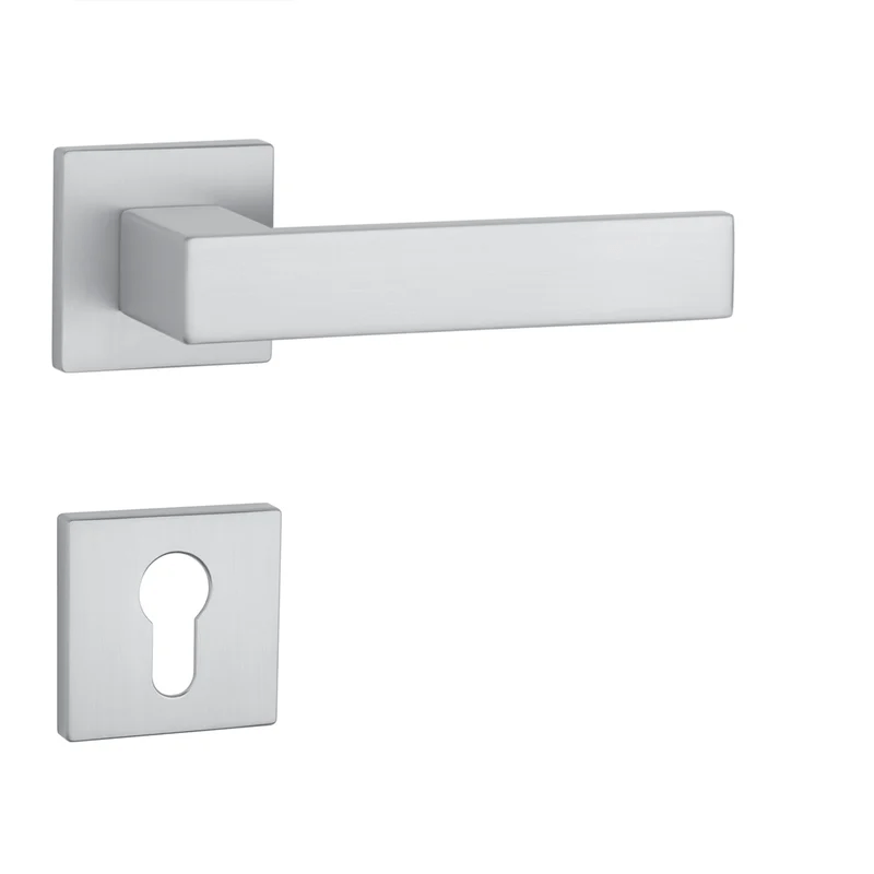 Rozetová klika na interiérové dveře s hranatou rozetou je vyrobena z materiálů vysoké kvality - zamak a je povrchově upravena. Rozeta má rozměry 52x52 mm a tloušťku jen 7 mm. Minimalistický design rozety s vysokou stabilitou kliky na dveřích působí jemně, a tím ponechává prostor pro vyniknutí designu samotné kliky.