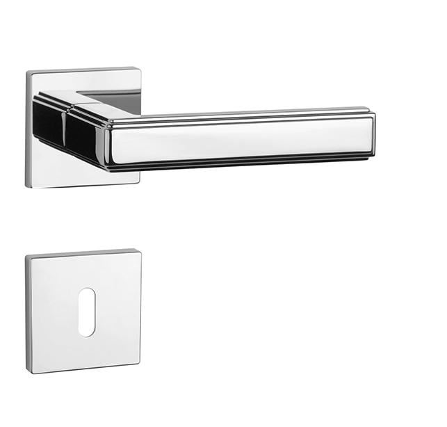 Rozetová klika na interiérové dveře s hranatou rozetou je vyrobena z materiálů vysoké kvality - zamak a je povrchově upravena. Rozeta má rozměry 52x52 mm a tloušťku jen 7 mm. Minimalistický design rozety s vysokou stabilitou kliky na dveřích působí jemně, a tím ponechává prostor pro vyniknutí designu samotné kliky.