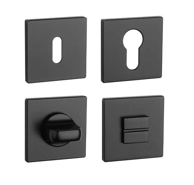 Hranatá rozeta je vyrobena z materiálů vysoké kvality - zamak a je povrchově upravena. Rozeta má rozměr 52x52 mm, tloušťku 5 mm a oválný otvor pro interiérový klíč (BB), otvor pro cylindrickou vložku (PZ), WC set s vmontovaným klíčem. Balení obsahuje 2 kusy rozet (pár) a rozety WC jsou v balení jako set.