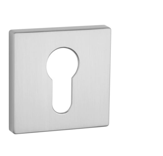 Hranatá rozeta je vyrobena z materiálů vysoké kvality - zamak a je povrchově upravena. Rozeta má rozměr 52x52 mm, tloušťku 5 mm a oválný otvor pro interiérový klíč (BB), otvor pro cylindrickou vložku (PZ), WC set s vmontovaným klíčem. Balení obsahuje 2 kusy rozet (pár) a rozety WC jsou v balení jako set.