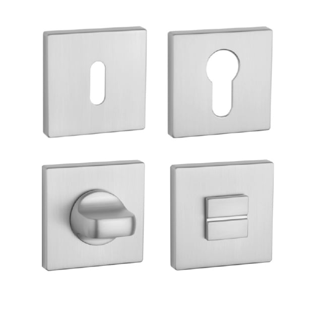 Hranatá rozeta je vyrobena z materiálů vysoké kvality - zamak a je povrchově upravena. Rozeta má rozměr 52x52 mm, tloušťku 5 mm a oválný otvor pro interiérový klíč (BB), otvor pro cylindrickou vložku (PZ), WC set s vmontovaným klíčem. Balení obsahuje 2 kusy rozet (pár) a rozety WC jsou v balení jako set.