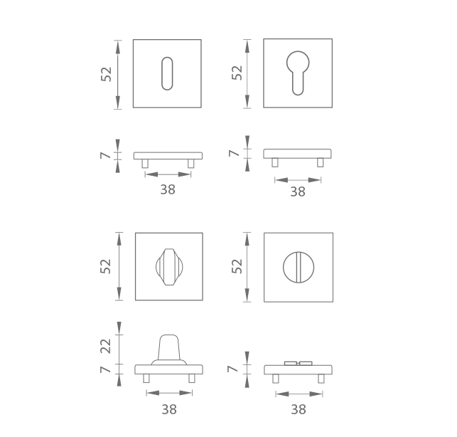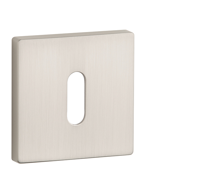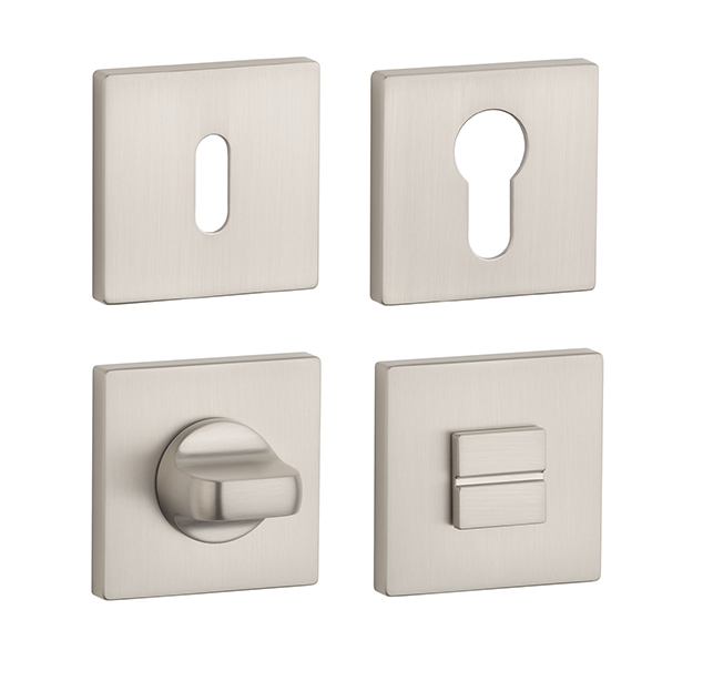 Hranatá rozeta je vyrobena z materiálů vysoké kvality - zamak a je povrchově upravena. Rozeta má rozměry 52 x 52 mm, tloušťku 7 mm a oválný otvor pro interiérový klíč (BB), otvor pro cylindrickou vložku (PZ), WC set s vmontovaným klíčem. Balení obsahuje 2 kusy rozet (pár) a rozety WC jsou v balení jako set.