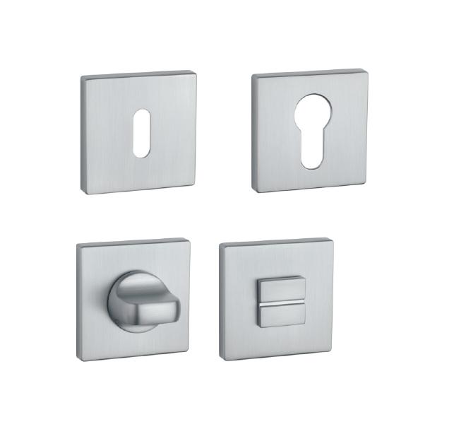 Hranatá rozeta je vyrobena z materiálů vysoké kvality - zamak a je povrchově upravena. Rozeta má rozměry 52 x 52 mm, tloušťku 7 mm a oválný otvor pro interiérový klíč (BB), otvor pro cylindrickou vložku (PZ), WC set s vmontovaným klíčem. Balení obsahuje 2 kusy rozet (pár) a rozety WC jsou v balení jako set.