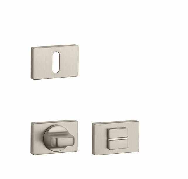 Obdelníková rozeta je vyrobena z materiálů vysoké kvality - zamak a je povrchově upravena. Rozeta má rozměry 50 x 33 mm, tloušťku 7 mm a oválný otvor pro interiérový klíč (BB), otvor pro cylindrickou vložku (PZ), WC set s vmontovaným klíčem. Balení obsahuje 2 kusy rozet (pár) a rozety WC jsou v balení jako set.