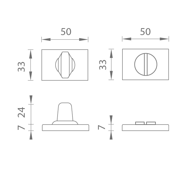 Obdelníková rozeta je vyrobena z materiálů vysoké kvality - zamak a je povrchově upravena. Rozeta má rozměry 50 x 33 mm, tloušťku 7 mm a oválný otvor pro interiérový klíč (BB), otvor pro cylindrickou vložku (PZ), WC set s vmontovaným klíčem. Balení obsahuje 2 kusy rozet (pár) a rozety WC jsou v balení jako set.
