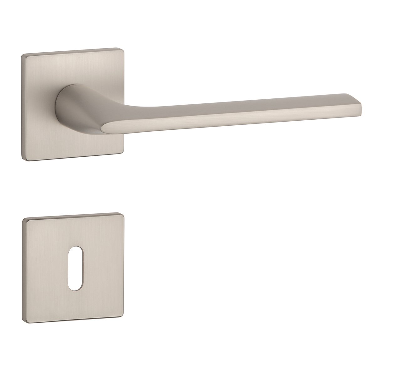 Rozetová klika na interiérové dveře s hranatou rozetou je vyrobena z materiálů vysoké kvality - zamak a je povrchově upravena. Rozeta má rozměr 52x52 mm a tloušťku jen 5 mm. Minimalistický design rozety s vysokou stabilitou kliky na dveřích působí jemně, a tím ponechává prostor pro vyniknutí designu samotné kliky.