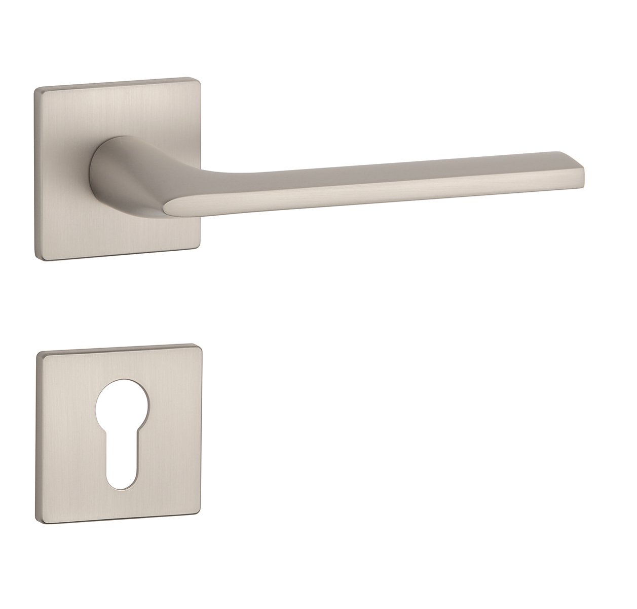 Rozetová klika na interiérové dveře s hranatou rozetou je vyrobena z materiálů vysoké kvality - zamak a je povrchově upravena. Rozeta má rozměr 52x52 mm a tloušťku jen 5 mm. Minimalistický design rozety s vysokou stabilitou kliky na dveřích působí jemně, a tím ponechává prostor pro vyniknutí designu samotné kliky.