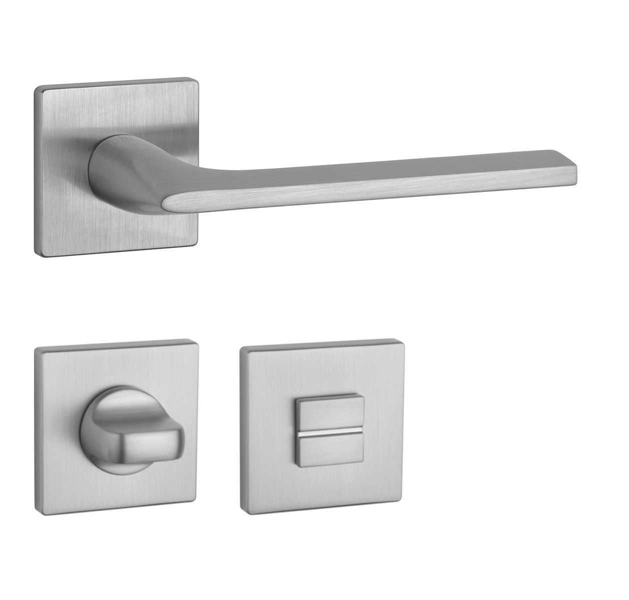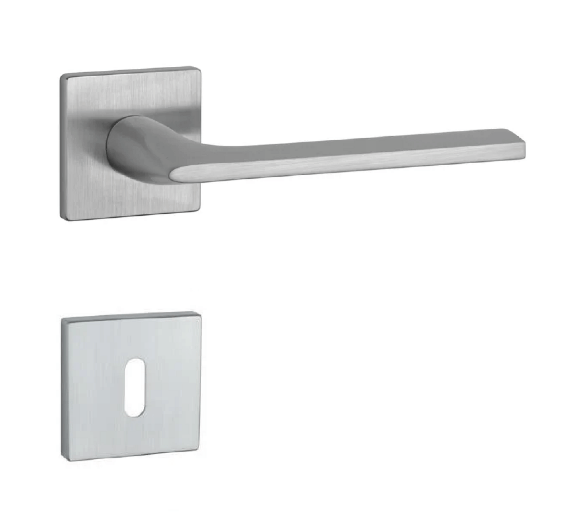 Rozetová klika na interiérové dveře s hranatou rozetou je vyrobena z materiálů vysoké kvality - zamak a je povrchově upravena. Rozeta má rozměr 52x52 mm a tloušťku jen 5 mm. Minimalistický design rozety s vysokou stabilitou kliky na dveřích působí jemně, a tím ponechává prostor pro vyniknutí designu samotné kliky.