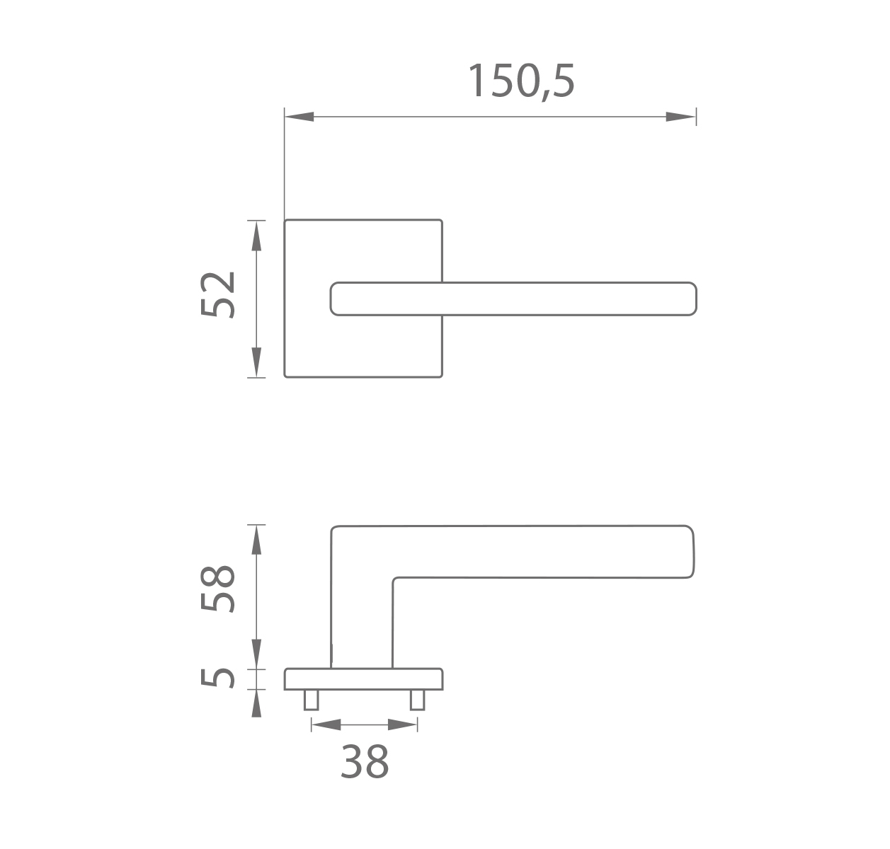 Rozetová klika na interiérové dveře s hranatou rozetou je vyrobena z materiálů vysoké kvality - zamak a je povrchově upravena. Rozeta má rozměr 52x52 mm a tloušťku jen 5 mm. Minimalistický design rozety s vysokou stabilitou kliky na dveřích působí jemně, a tím ponechává prostor pro vyniknutí designu samotné kliky.