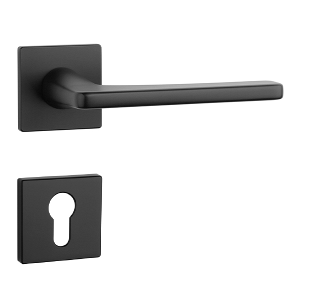 Rozetová klika na interiérové dveře s hranatou rozetou je vyrobena z materiálů vysoké kvality - zamak a je povrchově upravena. Rozeta má rozměr 52x52 mm a tloušťku jen 5 mm. Minimalistický design rozety s vysokou stabilitou kliky na dveřích působí jemně, a tím ponechává prostor pro vyniknutí designu samotné kliky.