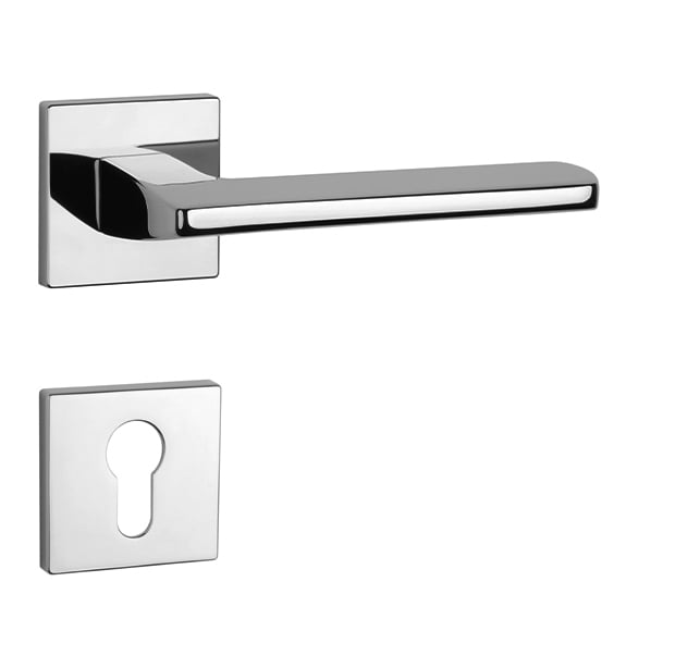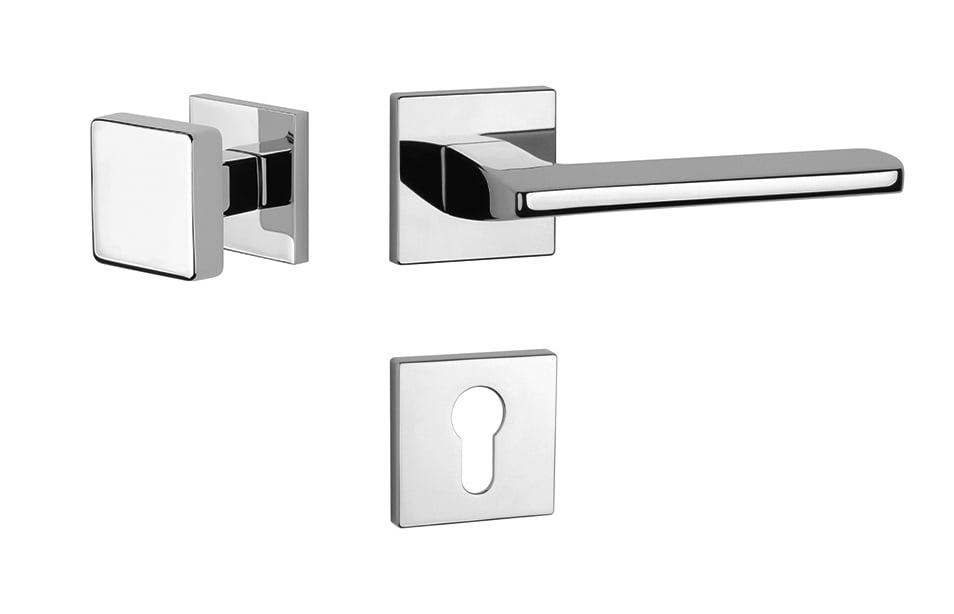 Rozetová klika na interiérové dveře s hranatou rozetou je vyrobena z materiálů vysoké kvality - zamak a je povrchově upravena. Rozeta má rozměr 52x52 mm a tloušťku jen 7 mm. Minimalistický design rozety s vysokou stabilitou kliky na dveřích působí jemně, a tím ponechává prostor pro vyniknutí designu samotné kliky.
