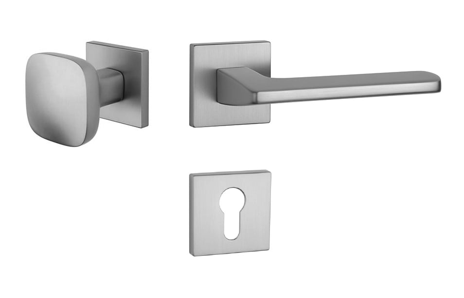 Rozetová klika na interiérové dveře s hranatou rozetou je vyrobena z materiálů vysoké kvality - zamak a je povrchově upravena. Rozeta má rozměr 52x52 mm a tloušťku jen 7 mm. Minimalistický design rozety s vysokou stabilitou kliky na dveřích působí jemně, a tím ponechává prostor pro vyniknutí designu samotné kliky.