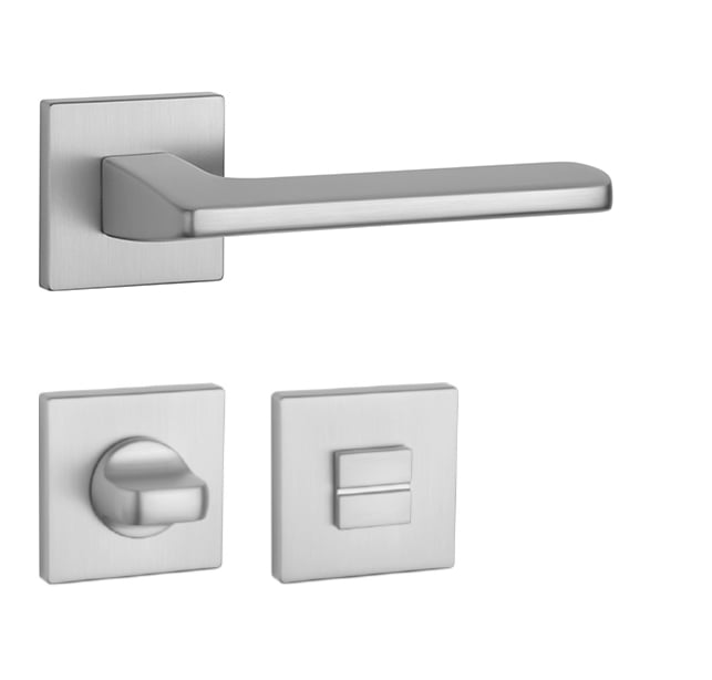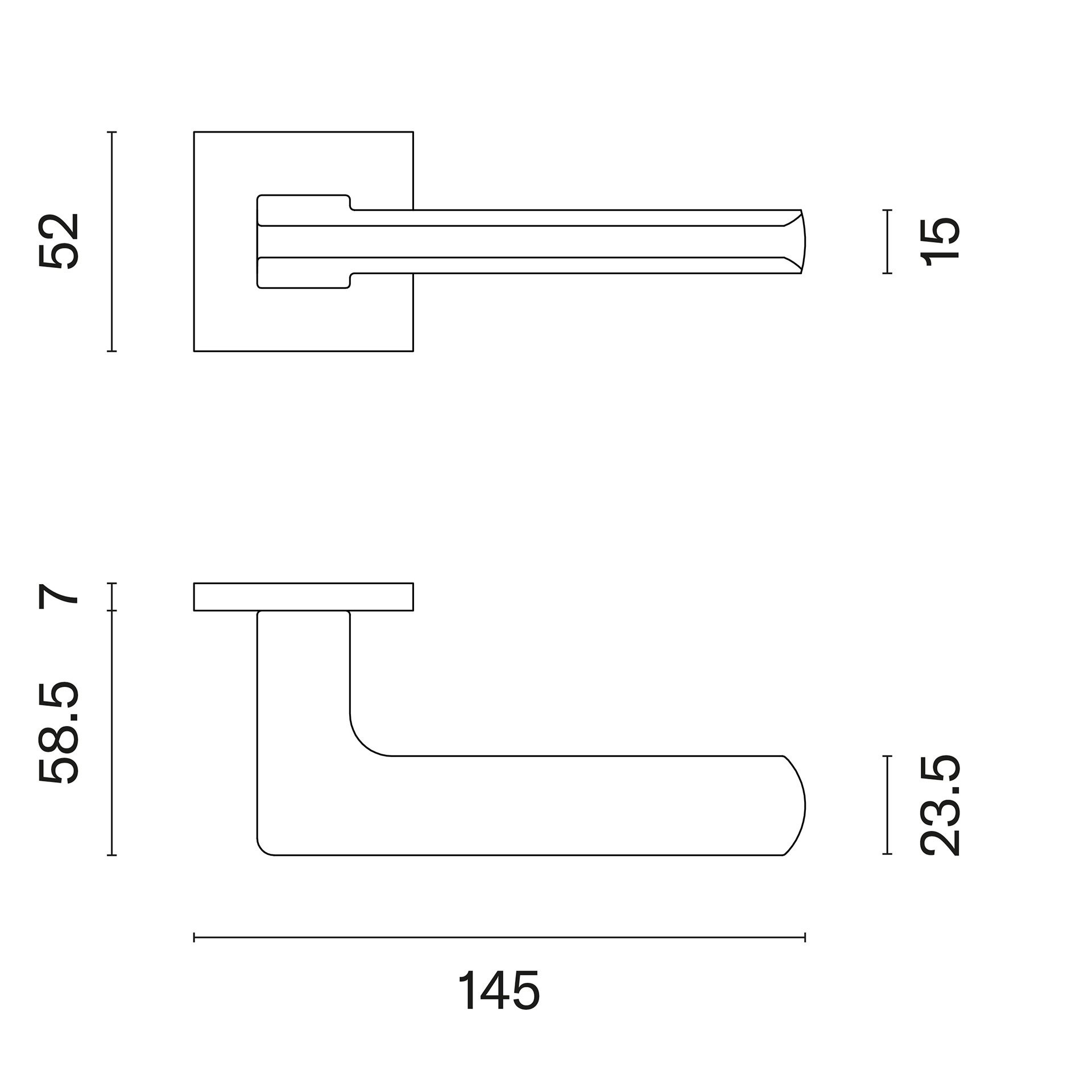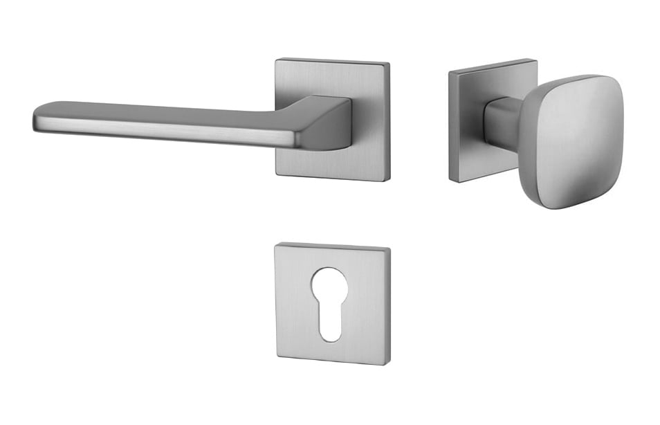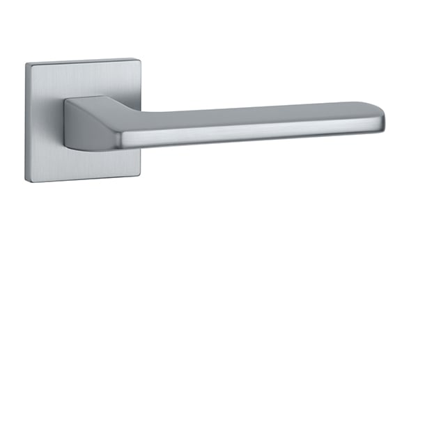 Rozetová klika na interiérové dveře s hranatou rozetou je vyrobena z materiálů vysoké kvality - zamak a je povrchově upravena. Rozeta má rozměr 52x52 mm a tloušťku jen 7 mm. Minimalistický design rozety s vysokou stabilitou kliky na dveřích působí jemně, a tím ponechává prostor pro vyniknutí designu samotné kliky.