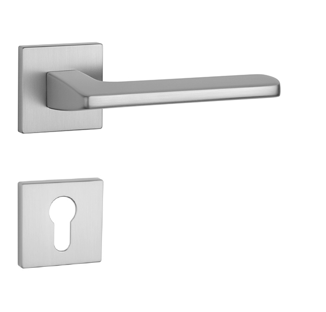 Rozetová klika na interiérové dveře s hranatou rozetou je vyrobena z materiálů vysoké kvality - zamak a je povrchově upravena. Rozeta má rozměr 52x52 mm a tloušťku jen 7 mm. Minimalistický design rozety s vysokou stabilitou kliky na dveřích působí jemně, a tím ponechává prostor pro vyniknutí designu samotné kliky.