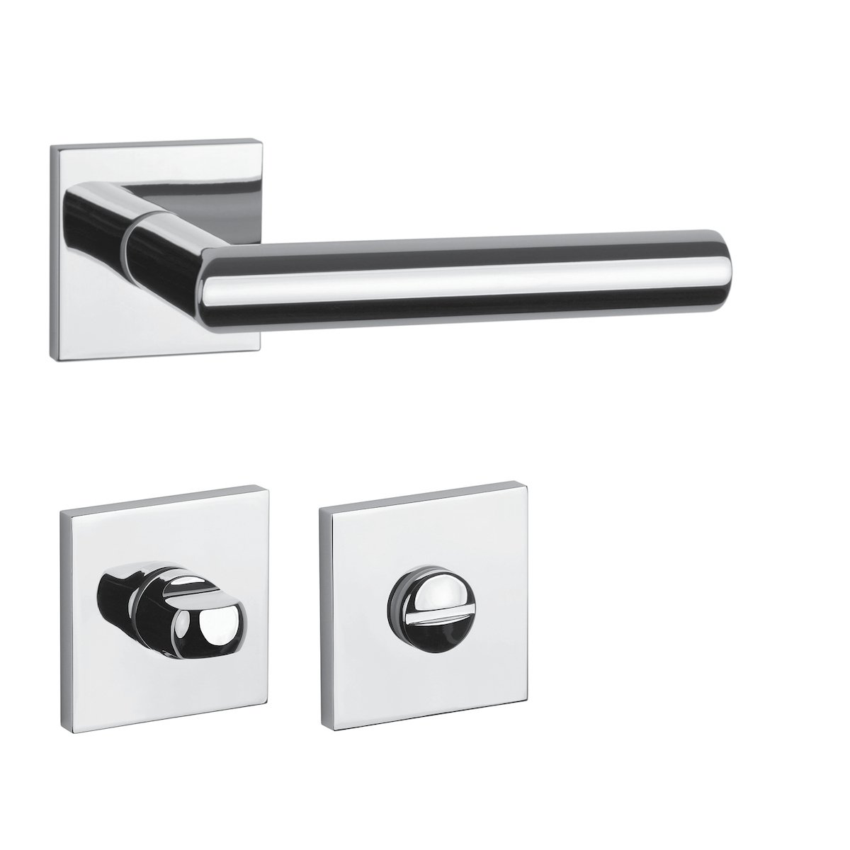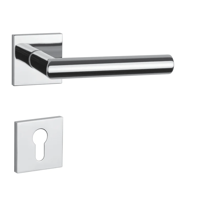 Rozetová klika na interiérové dveře s hranatou rozetou je vyrobena z materiálů vysoké kvality - zamak a je povrchově upravena. Rozeta má rozměr 52x52 mm a tloušťku jen 7 mm. Minimalistický design rozety s vysokou stabilitou kliky na dveřích působí jemně, a tím ponechává prostor pro vyniknutí designu samotné kliky.