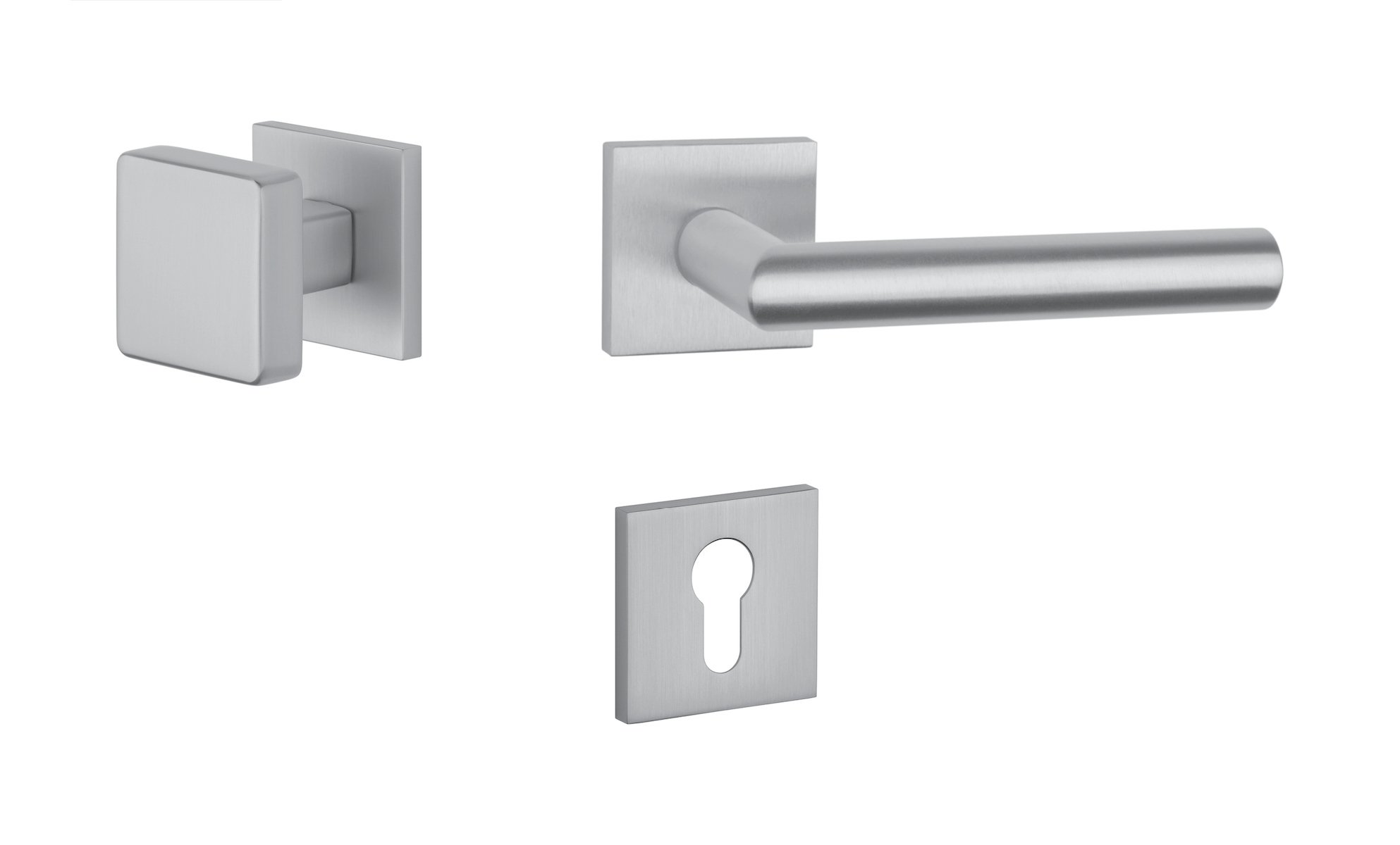 Rozetová klika na interiérové dveře s hranatou rozetou je vyrobena z materiálů vysoké kvality - zamak a je povrchově upravena. Rozeta má rozměr 52x52 mm a tloušťku jen 7 mm. Minimalistický design rozety s vysokou stabilitou kliky na dveřích působí jemně, a tím ponechává prostor pro vyniknutí designu samotné kliky.