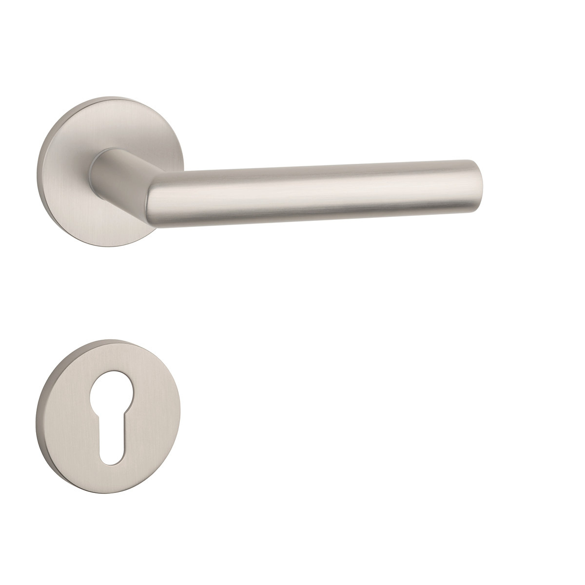 Rozetová klika na interiérové dveře s kulatou rozetou je vyrobena z materiálů vysoké kvality - zamak a je povrchově upravena. Rozeta má průměr 53 mm a tloušťku jen 7 mm. Minimalistický design rozety s vysokou stabilitou kliky na dveřích působí jemně, a tím ponechává prostor pro vyniknutí designu samotné kliky.