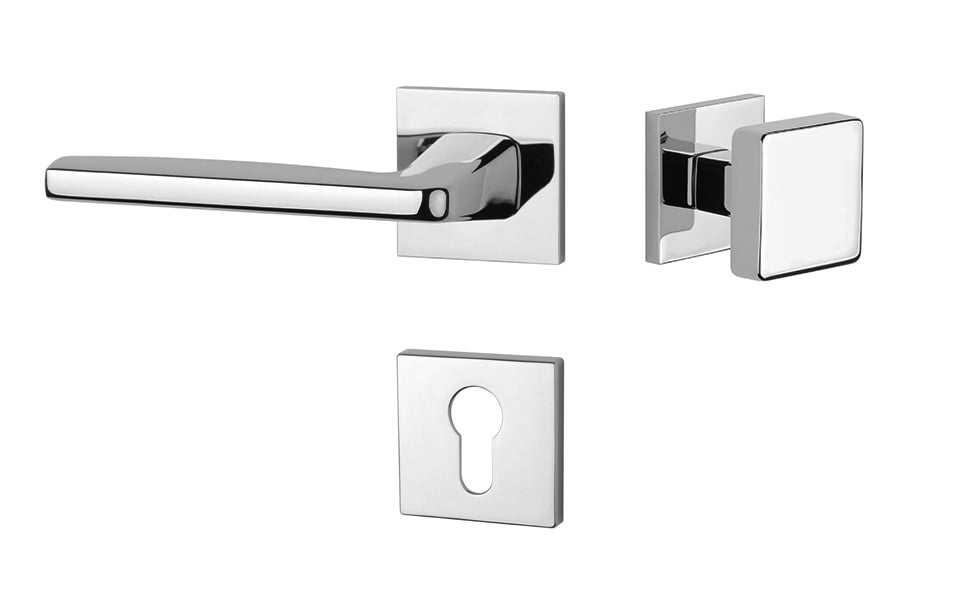 Rozetová klika na interiérové dveře s hranatou rozetou je vyrobena z materiálů vysoké kvality - zamak a je povrchově upravena. Rozeta má rozměr 52x52 mm a tloušťku jen 7 mm. Minimalistický design rozety s vysokou stabilitou kliky na dveřích působí jemně, a tím ponechává prostor pro vyniknutí designu samotné kliky.